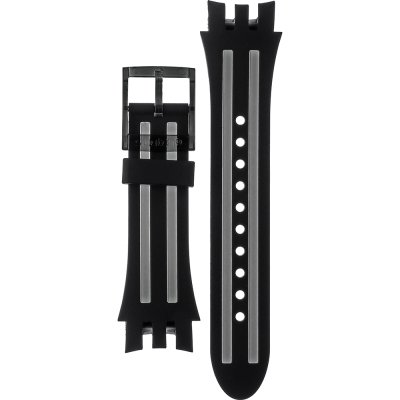 Dit Swatch horlogebandje is gemaakt van siliconen en wordt aan het horloge bevestigd door middel van stalen pennen. De band heeft een breedte van 21 mm en wordt gesloten door middel van een gesp. De band heeft geen rechte aanzet wat betekent dat deze band alleen geschikt is voor de horloges die hieronder worden vermeld.