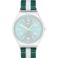 Dit Swatch horloge heeft een kast gemaakt van Roestvrijstaal met een diameter van 42 mm en is voorzien van een textiel band. In de kast bevindt zich een ETA kwaliteitsuurwerk en is afgewerkt met Acrylglas.