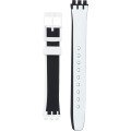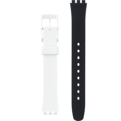 Dit Swatch horlogebandje is gemaakt van siliconen en wordt aan het horloge bevestigd door middel van stalen pennen. De band heeft een breedte van 12 mm en wordt gesloten door middel van een gesp. De band heeft geen rechte aanzet wat betekent dat deze band alleen geschikt is voor de horloges die hieronder worden vermeld.