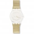 Dit Swatch horlogebandje is gemaakt van roestvrij staal en wordt aan het horloge bevestigd door middel van stalen pennen. De band heeft een breedte van 17 mm. De band heeft geen rechte aanzet wat betekent dat deze band alleen geschikt is voor de horloges die hieronder worden vermeld.
