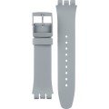 Dit Swatch horlogebandje is gemaakt van siliconen en wordt aan het horloge bevestigd door middel van stalen pennen. De band heeft een breedte van 19.7 mm en wordt gesloten door middel van een gesp. De band heeft geen rechte aanzet wat betekent dat deze band alleen geschikt is voor de horloges die hieronder worden vermeld.