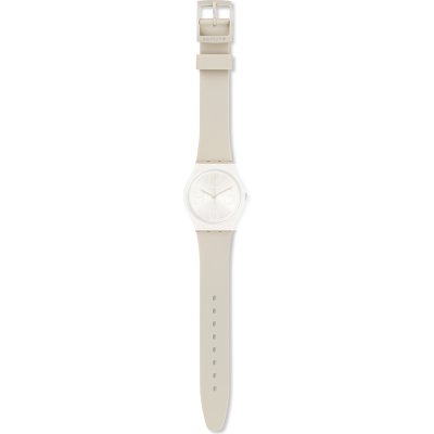 Dit Swatch horlogebandje is gemaakt van siliconen en wordt aan het horloge bevestigd door middel van stalen pennen. De band heeft een breedte van 17 mm en wordt gesloten door middel van een gesp. De band heeft geen rechte aanzet wat betekent dat deze band alleen geschikt is voor de horloges die hieronder worden vermeld.