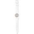Dit Swatch horlogebandje is gemaakt van siliconen en wordt aan het horloge bevestigd door middel van stalen pennen. De band heeft een breedte van 17 mm en wordt gesloten door middel van een gesp. De band heeft geen rechte aanzet wat betekent dat deze band alleen geschikt is voor de horloges die hieronder worden vermeld.