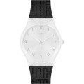 Dit Swatch horlogebandje is gemaakt van siliconen en wordt aan het horloge bevestigd door middel van stalen pennen. De band heeft een breedte van 17 mm en wordt gesloten door middel van een gesp. De band heeft geen rechte aanzet wat betekent dat deze band alleen geschikt is voor de horloges die hieronder worden vermeld.