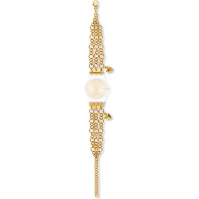 Dit Swatch horlogebandje is gemaakt van roestvrij staal en wordt aan het horloge bevestigd door middel van stalen pennen. De band heeft een breedte van 12 mm en wordt gesloten door middel van een sieraadsluiting. De band heeft geen rechte aanzet wat betekent dat deze band alleen geschikt is voor de horloges die hieronder worden vermeld.