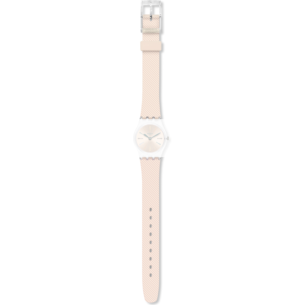 Dit Swatch horlogebandje is gemaakt van siliconen en wordt aan het horloge bevestigd door middel van stalen pennen. De band heeft een breedte van 12 mm en wordt gesloten door middel van een gesp. De band heeft geen rechte aanzet wat betekent dat deze band alleen geschikt is voor de horloges die hieronder worden vermeld.