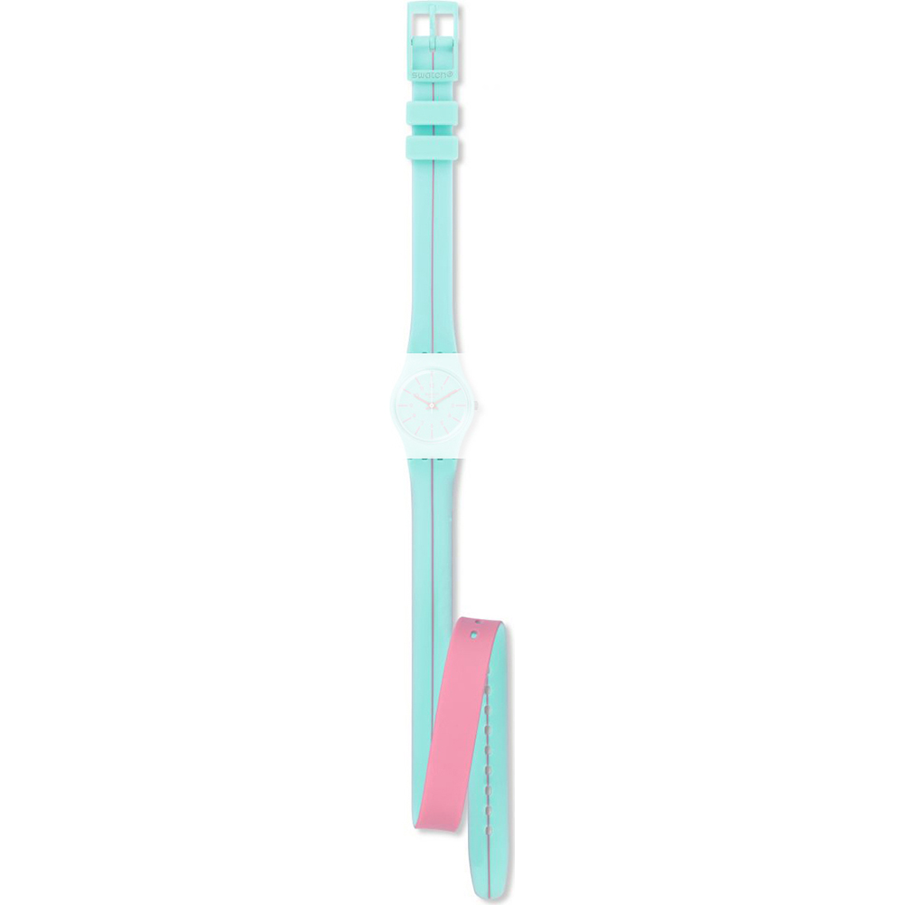 Dit Swatch horlogebandje is gemaakt van siliconen en wordt aan het horloge bevestigd door middel van stalen pennen. De band heeft een breedte van 12 mm en wordt gesloten door middel van een gesp. De band heeft geen rechte aanzet wat betekent dat deze band alleen geschikt is voor de horloges die hieronder worden vermeld.