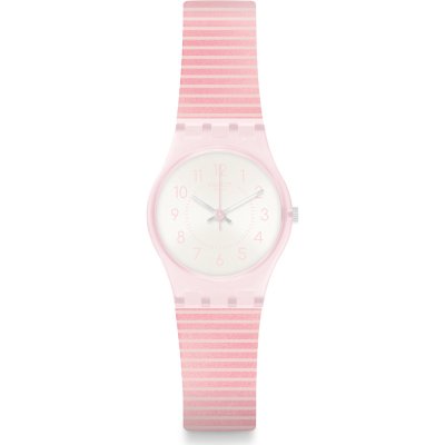 Dit Swatch horlogebandje is gemaakt van siliconen en wordt aan het horloge bevestigd door middel van stalen pennen. De band heeft een breedte van 12 mm en wordt gesloten door middel van een gesp. De band heeft geen rechte aanzet wat betekent dat deze band alleen geschikt is voor de horloges die hieronder worden vermeld.