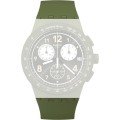 Dit Swatch horlogebandje is gemaakt van siliconen en wordt aan het horloge bevestigd door middel van stalen pennen. De band heeft een breedte van 20.1 mm en wordt gesloten door middel van een gesp. De band heeft geen rechte aanzet wat betekent dat deze band alleen geschikt is voor de horloges die hieronder worden vermeld.