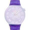 Dit Swatch horlogebandje is gemaakt van bio-plastic en wordt aan het horloge bevestigd door middel van stalen pennen. De band heeft een breedte van 19.7 mm en wordt gesloten door middel van een vlindersluiting met drukknoppen. De band heeft geen rechte aanzet wat betekent dat deze band alleen geschikt is voor de horloges die hieronder worden vermeld.