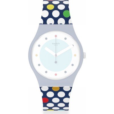Dit Swatch horlogebandje is gemaakt van siliconen en wordt aan het horloge bevestigd door middel van stalen pennen. De band heeft een breedte van 17 mm en wordt gesloten door middel van een gesp. De band heeft geen rechte aanzet wat betekent dat deze band alleen geschikt is voor de horloges die hieronder worden vermeld.