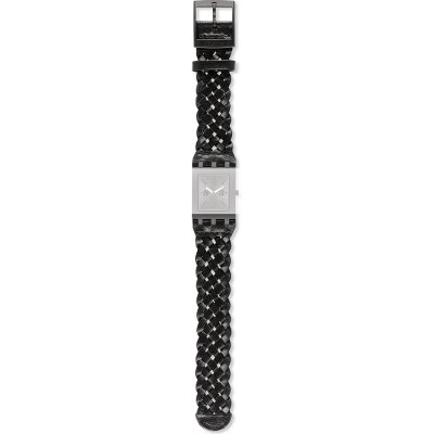 Dit Swatch horlogebandje is gemaakt van leer en wordt aan het horloge bevestigd door middel van stalen pennen. De band heeft een breedte van 18 mm en wordt gesloten door middel van een gesp. De band heeft geen rechte aanzet wat betekent dat deze band alleen geschikt is voor de horloges die hieronder worden vermeld.