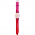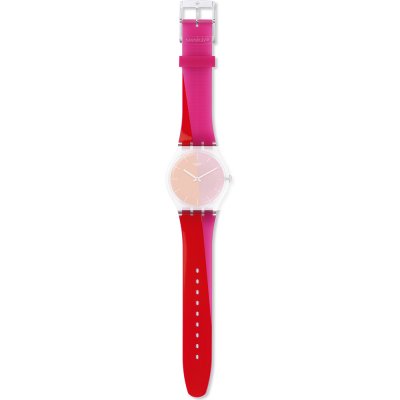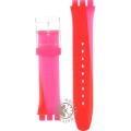 Dit Swatch horlogebandje is gemaakt van siliconen en wordt aan het horloge bevestigd door middel van stalen pennen. De band heeft een breedte van 19.7 mm en wordt gesloten door middel van een gesp. De band heeft geen rechte aanzet wat betekent dat deze band alleen geschikt is voor de horloges die hieronder worden vermeld.