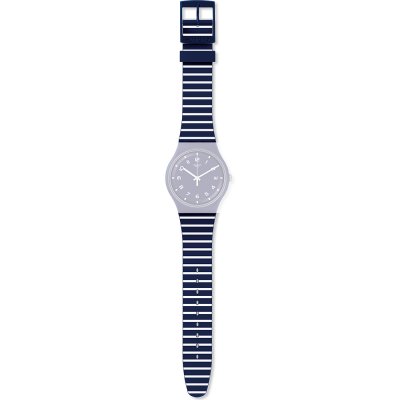 Dit Swatch horlogebandje is gemaakt van siliconen en wordt aan het horloge bevestigd door middel van stalen pennen. De band heeft een breedte van 19.7 mm en wordt gesloten door middel van een gesp. De band heeft geen rechte aanzet wat betekent dat deze band alleen geschikt is voor de horloges die hieronder worden vermeld.
