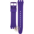 Dit Swatch horlogebandje is gemaakt van siliconen en wordt aan het horloge bevestigd door middel van stalen pennen. De band heeft een breedte van 19.7 mm en wordt gesloten door middel van een gesp. De band heeft geen rechte aanzet wat betekent dat deze band alleen geschikt is voor de horloges die hieronder worden vermeld.