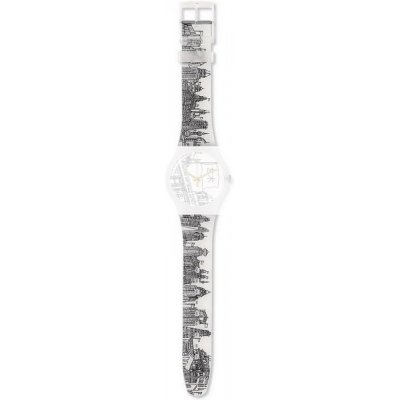 Dit Swatch horlogebandje is gemaakt van siliconen en wordt aan het horloge bevestigd door middel van stalen pennen. De band heeft een breedte van 19.7 mm en wordt gesloten door middel van een gesp. De band heeft geen rechte aanzet wat betekent dat deze band alleen geschikt is voor de horloges die hieronder worden vermeld.