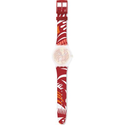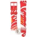 Dit Swatch horlogebandje is gemaakt van siliconen en wordt aan het horloge bevestigd door middel van stalen pennen. De band heeft een breedte van 19.7 mm en wordt gesloten door middel van een gesp. De band heeft geen rechte aanzet wat betekent dat deze band alleen geschikt is voor de horloges die hieronder worden vermeld.