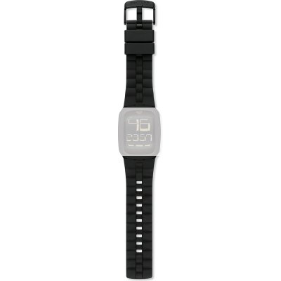 Dit Swatch horlogebandje is gemaakt van siliconen en wordt aan het horloge bevestigd door middel van stalen pennen. De band heeft een breedte van 28 mm en wordt gesloten door middel van een gesp. De band heeft geen rechte aanzet wat betekent dat deze band alleen geschikt is voor de horloges die hieronder worden vermeld.