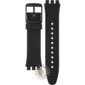Dit Swatch horlogebandje is gemaakt van siliconen en wordt aan het horloge bevestigd door middel van stalen pennen. De band heeft een breedte van 19.8 mm en wordt gesloten door middel van een gesp. De band heeft geen rechte aanzet wat betekent dat deze band alleen geschikt is voor de horloges die hieronder worden vermeld.