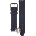 Dit Swatch horlogebandje is gemaakt van siliconen en wordt aan het horloge bevestigd door middel van stalen pennen. De band heeft een breedte van 19.8 mm en wordt gesloten door middel van een gesp. De band heeft geen rechte aanzet wat betekent dat deze band alleen geschikt is voor de horloges die hieronder worden vermeld.