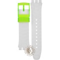 Dit Swatch horlogebandje is gemaakt van siliconen en wordt aan het horloge bevestigd door middel van stalen pennen. De band heeft een breedte van 21.3 mm en wordt gesloten door middel van een gesp. De band heeft geen rechte aanzet wat betekent dat deze band alleen geschikt is voor de horloges die hieronder worden vermeld.