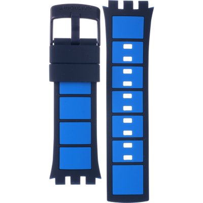 Dit Swatch horlogebandje is gemaakt van siliconen en wordt aan het horloge bevestigd door middel van stalen pennen. De band heeft een breedte van 28 mm en wordt gesloten door middel van een gesp. De band heeft geen rechte aanzet wat betekent dat deze band alleen geschikt is voor de horloges die hieronder worden vermeld.