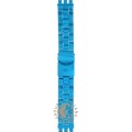 Dit Swatch horlogebandje is gemaakt van aluminium en wordt aan het horloge bevestigd door middel van stalen pennen. De band heeft een breedte van 19.9 mm en wordt gesloten door middel van een vouwsluiting met drukknoppen en veiligheidsklep. De band heeft geen rechte aanzet wat betekent dat deze band alleen geschikt is voor de horloges die hieronder worden vermeld.