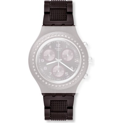 Dit Swatch horlogebandje is gemaakt van aluminium en wordt aan het horloge bevestigd door middel van stalen pennen. De band heeft een breedte van 19.9 mm en wordt gesloten door middel van een vouwsluiting met veiligheidsklep. De band heeft geen rechte aanzet wat betekent dat deze band alleen geschikt is voor de horloges die hieronder worden vermeld.