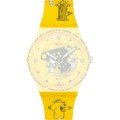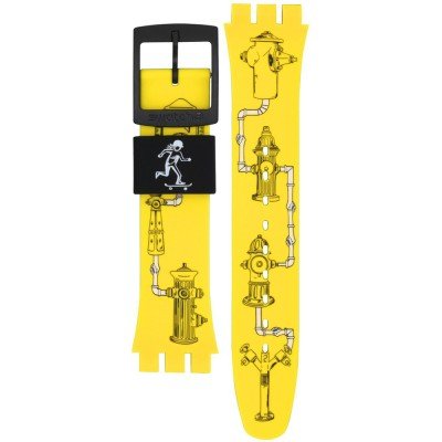 Dit Swatch horlogebandje is gemaakt van siliconen en wordt aan het horloge bevestigd door middel van stalen pennen. De band heeft een breedte van 19.7 mm en wordt gesloten door middel van een gesp. De band heeft geen rechte aanzet wat betekent dat deze band alleen geschikt is voor de horloges die hieronder worden vermeld.