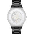 Dit Swatch horlogebandje is gemaakt van roestvrij staal en wordt aan het horloge bevestigd door middel van stalen pennen. De band heeft een breedte van 20 mm en wordt gesloten door middel van een vlindersluiting met drukknoppen. De band heeft geen rechte aanzet wat betekent dat deze band alleen geschikt is voor de horloges die hieronder worden vermeld.