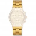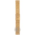 Dit Swatch horlogebandje is gemaakt van aluminium en wordt aan het horloge bevestigd door middel van stalen pennen. De band heeft een breedte van 19.7 mm en wordt gesloten door middel van een vouwsluiting met veiligheidsklep. De band heeft geen rechte aanzet wat betekent dat deze band alleen geschikt is voor de horloges die hieronder worden vermeld.