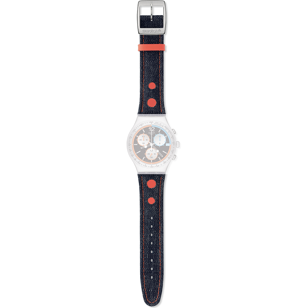 Dit Swatch horlogebandje is gemaakt van met textiel overtrokken leer en wordt aan het horloge bevestigd door middel van stalen pennen. De band heeft een breedte van 19.7 mm en wordt gesloten door middel van een gesp. De band heeft geen rechte aanzet wat betekent dat deze band alleen geschikt is voor de horloges die hieronder worden vermeld.