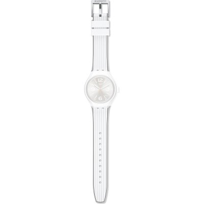 Dit Swatch horlogebandje is gemaakt van siliconen en wordt aan het horloge bevestigd door middel van stalen pennen. De band heeft een breedte van 18.1 mm en wordt gesloten door middel van een gesp. De band heeft geen rechte aanzet wat betekent dat deze band alleen geschikt is voor de horloges die hieronder worden vermeld.