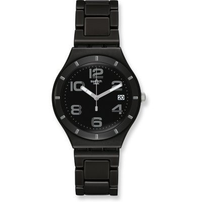 Dit Swatch horlogebandje is gemaakt van aluminium en wordt aan het horloge bevestigd door middel van stalen pennen. De band heeft een breedte van 17 mm en wordt gesloten door middel van een vouwsluiting met drukknoppen en veiligheidsklep. De band heeft geen rechte aanzet wat betekent dat deze band alleen geschikt is voor de horloges die hieronder worden vermeld.