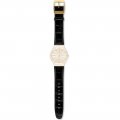 Dit Swatch horlogebandje is gemaakt van leer en wordt aan het horloge bevestigd door middel van stalen pennen. De band heeft een breedte van 17 mm en wordt gesloten door middel van een gesp. De band heeft geen rechte aanzet wat betekent dat deze band alleen geschikt is voor de horloges die hieronder worden vermeld.