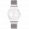 Dit Swatch horlogebandje is gemaakt van roestvrij staal en wordt aan het horloge bevestigd door middel van stalen pennen. De band heeft een breedte van 19.6 mm en wordt gesloten door middel van een onzichtbare vlindersluiting. De band heeft geen rechte aanzet wat betekent dat deze band alleen geschikt is voor de horloges die hieronder worden vermeld.