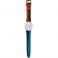 Dit Swatch horlogebandje is gemaakt van met textiel overtrokken leer en wordt aan het horloge bevestigd door middel van stalen pennen. De band heeft een breedte van 17 mm en wordt gesloten door middel van een gesp. De band heeft geen rechte aanzet wat betekent dat deze band alleen geschikt is voor de horloges die hieronder worden vermeld.