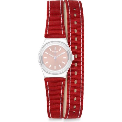 Dit Swatch horlogebandje is gemaakt van met textiel overtrokken leer en wordt aan het horloge bevestigd door middel van stalen pennen. De band heeft een breedte van 12 mm en wordt gesloten door middel van een gesp. De band heeft geen rechte aanzet wat betekent dat deze band alleen geschikt is voor de horloges die hieronder worden vermeld.