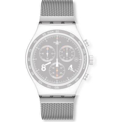 Dit Swatch horlogebandje is gemaakt van roestvrij staal en wordt aan het horloge bevestigd door middel van stalen pennen. De band heeft een breedte van 21 mm en wordt gesloten door middel van een milanese sluiting. De band heeft geen rechte aanzet wat betekent dat deze band alleen geschikt is voor de horloges die hieronder worden vermeld.