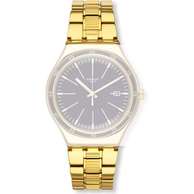 Dit Swatch horlogebandje is gemaakt van roestvrij staal en wordt aan het horloge bevestigd door middel van stalen pennen. De band heeft een breedte van 18.9 mm en wordt gesloten door middel van een vouwsluiting met veiligheidsklep. De band heeft geen rechte aanzet wat betekent dat deze band alleen geschikt is voor de horloges die hieronder worden vermeld.