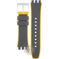 Dit Swatch horlogebandje is gemaakt van siliconen en wordt aan het horloge bevestigd door middel van stalen pennen. De band heeft een breedte van 19.7 mm en wordt gesloten door middel van een gesp. De band heeft geen rechte aanzet wat betekent dat deze band alleen geschikt is voor de horloges die hieronder worden vermeld.
