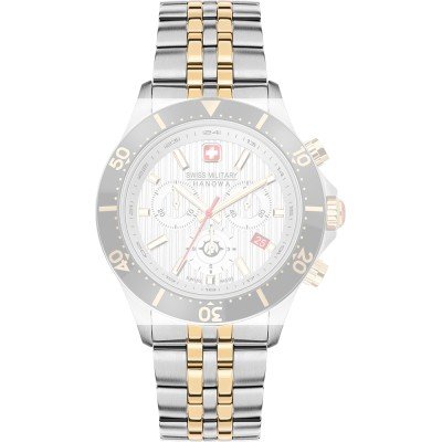 Dit Swiss Military Hanowa horlogebandje is gemaakt van roestvrij staal en wordt aan het horloge bevestigd door middel van bandpennen. De band heeft een breedte van 22 mm en wordt gesloten door middel van een vouwsluiting met drukknoppen en veiligheidsklep. De band heeft geen rechte aanzet wat betekent dat deze band alleen geschikt is voor de horloges die hieronder worden vermeld.