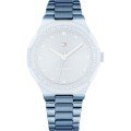 Dit Tommy Hilfiger horlogebandje is gemaakt van roestvrij staal en wordt aan het horloge bevestigd door middel van bandpennen. De band heeft een breedte van 18 mm en wordt gesloten door middel van een vouwsluiting met drukknoppen. De band heeft geen rechte aanzet wat betekent dat deze band alleen geschikt is voor de horloges die hieronder worden vermeld.