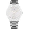 Dit Tommy Hilfiger horlogebandje is gemaakt van roestvrij staal en wordt aan het horloge bevestigd door middel van bandpennen. De band heeft een breedte van 18 mm en wordt gesloten door middel van een vouwsluiting met drukknoppen. De band heeft geen rechte aanzet wat betekent dat deze band alleen geschikt is voor de horloges die hieronder worden vermeld.