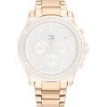 Dit Tommy Hilfiger horlogebandje is gemaakt van roestvrij staal en wordt aan het horloge bevestigd door middel van bandpennen. De band heeft een breedte van 20 mm en wordt gesloten door middel van een vouwsluiting met drukknoppen. De band heeft geen rechte aanzet wat betekent dat deze band alleen geschikt is voor de horloges die hieronder worden vermeld.