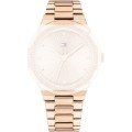 Dit Tommy Hilfiger horlogebandje is gemaakt van roestvrij staal en wordt aan het horloge bevestigd door middel van bandpennen. De band heeft een breedte van 18 mm en wordt gesloten door middel van een vouwsluiting met drukknoppen. De band heeft geen rechte aanzet wat betekent dat deze band alleen geschikt is voor de horloges die hieronder worden vermeld.