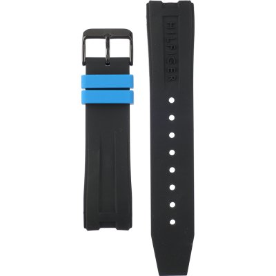 Dit Tommy Hilfiger horlogebandje is gemaakt van siliconen en wordt aan het horloge bevestigd door middel van bandpennen. De band heeft een breedte van 22 mm en wordt gesloten door middel van een gesp. De band heeft geen rechte aanzet wat betekent dat deze band alleen geschikt is voor de horloges die hieronder worden vermeld.