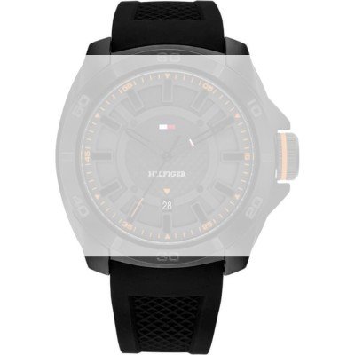 Dit Tommy Hilfiger horlogebandje is gemaakt van siliconen en wordt aan het horloge bevestigd door middel van bandpennen. De band heeft een breedte van 24 mm en wordt gesloten door middel van een gesp. De band heeft geen rechte aanzet wat betekent dat deze band alleen geschikt is voor de horloges die hieronder worden vermeld.